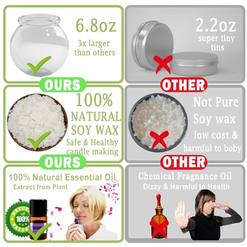 why choose us: our soy wax candle making kits adopts premium 100% natual soy wax, 100% natural essential oils. 8pack 6.8oz glass bottles