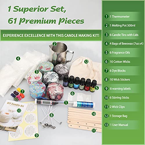 Diy Candle Making Starter Set, Each set is packed with care and includes everything you need to get 1 melting pot 500ml, 4 bags of beeswax 7oz each, 6 candle tins with lids, 6 scents, 10 cotton wicks, 6 dye blocks, 10 wick stickers, 6 labels, 6 stirring sticks, 2 wick clips, 1 storage bag, 1 thermometer and an user manual.