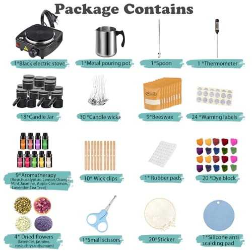 🎁Premium Candle Making Kit:Our candle making supplies is suitable for all levels and contains everything needed to make scented homemade candles: 9 candle essential scents(Rose+Eucalyptus +Lemon+Orange+Mint+Jasmine+Apple Cinnamon+Lavender +Tea Tree essential oil), 9 bags of Beeswax, 1 thermometer(With battery),1 pouring pot, 1 candle wax melter, 1 spoon, 20 wick clips,18 candle tins,30 candle wicks,20 stickers,24 Warning labels, 1 Scissors, 1 rubber pads, 20 dye, 4 Dried flower.