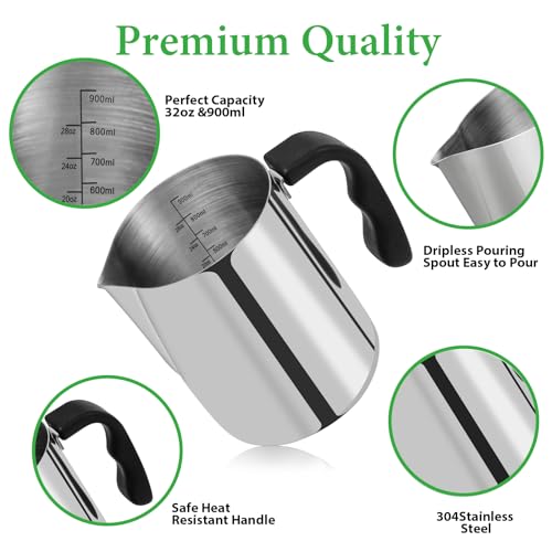 🧡【Candle Melting Pot】This candle making pouring pot can hold 32oz/900ml of molten wax. This melting wax pot is made of high quality 304 stainless steel, with strong Anti-rust, high temperature and corrosion resistance. There is no dripping at the pouring mouth, which controls the flow and prevents leakage.