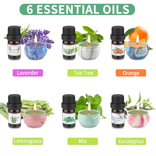 ✨ MAKING COLORFUL SCENTED CANDLES – The candle kit comes with 6* premium Pure Essential Oils: Lavender, Tea Tree, Orange, Lemongrass, Mint and Eucalyptus, and 4* Dyes: Blue, Red, Yellow & Purple. Fully unleash your creativity and make these colorful aromatherapy candles the best decor for your living room, bedroom, dining room,office and more.