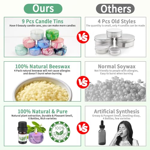 ✨ CANDLE MAKING STARTER KIT – Complete DIY Kit includes: 4* 4.4oz Beeswax, 4* Wax Dyes, 6* Candle Essential Oils, 1* Melting Pot, 9* Candle Tins, 100* Cotton Wicks, 100* Candles Wicks Stickers, 4* Centering Device, 1* Stirring Spoon, 1* User Manual and Exquisite Gift Box. This candle making kit for adults, kids and beginners is a great starter kit, offer them a great experience to create perfect candles with friends or family.