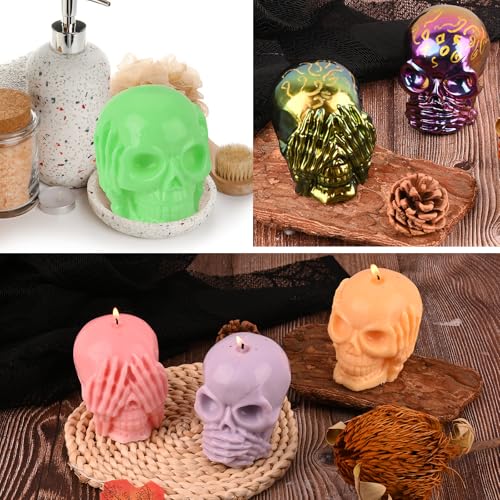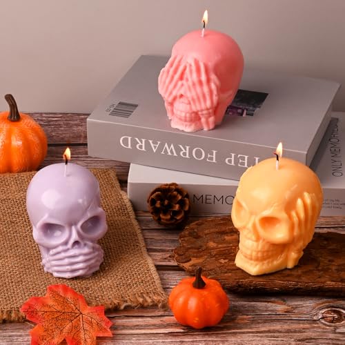 HUAKENER 3 Pack Skull Candle Molds, 3D Skull Resin Molds, Hear-no, Speak-no, See-no Skull Silicone Molds for Candle, Epoxy Resin, Soap, Halloween Cake Decor