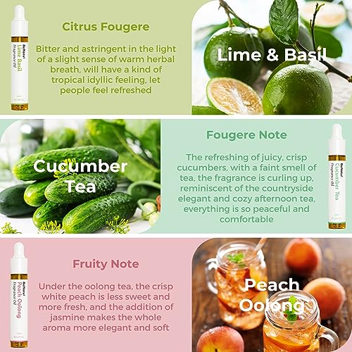 Summer Fragrance Oils: Highly concentrated exclusive formula, alcohol-free. Set of Lime Basil, Cucumber Tea, Peach Oolong, Strawberry Yogurt, Melon Juice, Blackberry Bay.