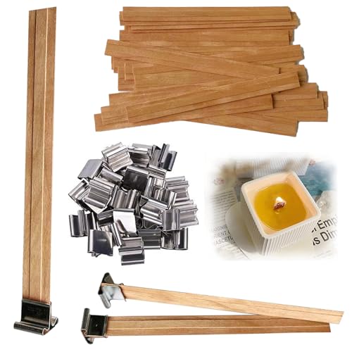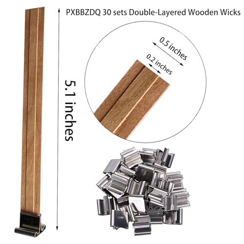🌈【MATERIAL】: Wood 🌈【Package includes】: 30 sets wooden candle wicks 30 iron Shelfs Size: The layer 1 of the double-layered wooden wick is 5.1 x 0.5 inches and layer 2 is 5.1 x 0.2 inches in size. 🌈【WARM TIPS】 ⭐1. Please make sure soak the candle wicks in wax (molten) 5-10 minutes before candle making. ⭐2. . It’s important to trim the wick close to the wax so it has fuel to ignite. If won’t stay lit, try to trim shorter, 1/8″ is perfect.If the wax wick is too long, it will not absorb the wax at the bottom. If the wax wick is too short, the flame will be too small or unable to burn because the wax oil covers the wax wick. If won’t stay lit, try to trim shorter.