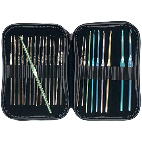 Crochet hook kit comes with (16) steel crochet hooks, (8) aluminum crochet hooks, and (1) 5″ x 7″ carrying case.