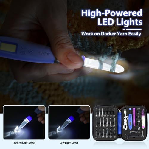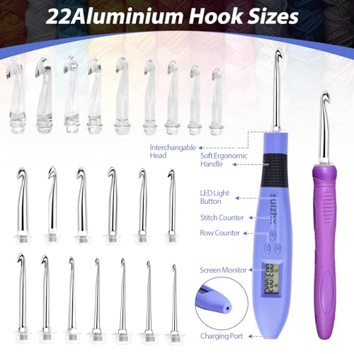 Counting Crochet Hook Set Digital, Crochet Kit with 22 Different Size Interchangeable Crochet Needle, Light Up Crochet Hooks for Stitch & Row Counter, Ergonomic Crochet Hooks with 2 Levels Led