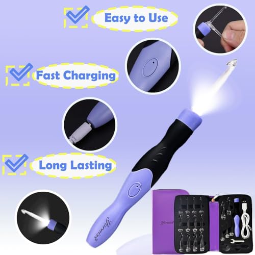 What You Get – The complete lighted crochet hooks set contains 17 size interchangeable hooks, 1 USB cable, 2 wrench, 1 purple compact storage case.