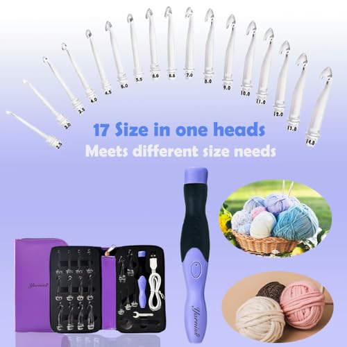 17 in 1 Head – The rechargeable crochet hooks include for 17 size from 2.5mm to 14.0mm,it can meet your different crochet requirement from lace to chunky yarn. BUT please fix the head with WRENCH TIGHTLY!