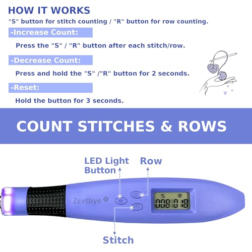 【Digital Crochet Counter】By clicking the button “S” & “R” on the handle, the number of rows and stitches can be recorded in real time, and the data of the last stitch and the last row can also be stored. Gently tap the button to increase the count point by 1. Long press for one second to decrease the count point by 1. Long press for three seconds to reset. The counter will remember your last count until you clear it.NOTE that this crochet yarn does not automatically count.