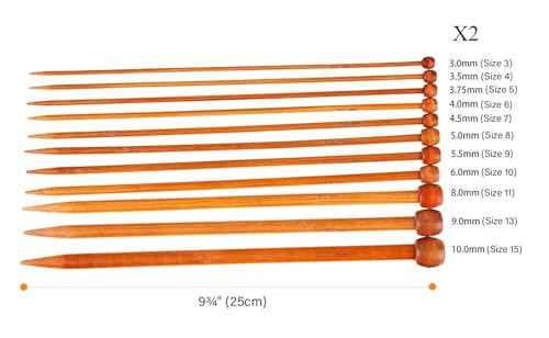 This knitting kit includes 11 pairs of needles in a wide range of sizes: 10mm (Size 15), 9mm (Size 13), 8mm (Size 11), 6mm (Size 10), 5.5mm (Size 9), 5mm (Size 8), 4.5mm (Size 7), 4mm (Size 6), 3.75mm (Size 5), 3.5mm (Size 4), and 3mm (Size 3).