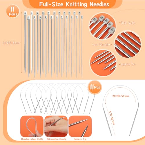 The knitting starter kit features both straight knitting needles and circular knitting needles in various sizes, allowing you to adapt to different projects and stitch patterns.
