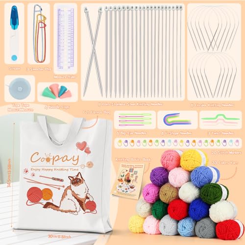 Coopay Knitting Kit for Beginners w/20 Colors Yarn, Knitting Set Include 11 Pairs Knitting Needles Set & 11 Circular Knitting Needles with Cat Tote Bag Knitting Book, Knitting Kit for Beginners Adults