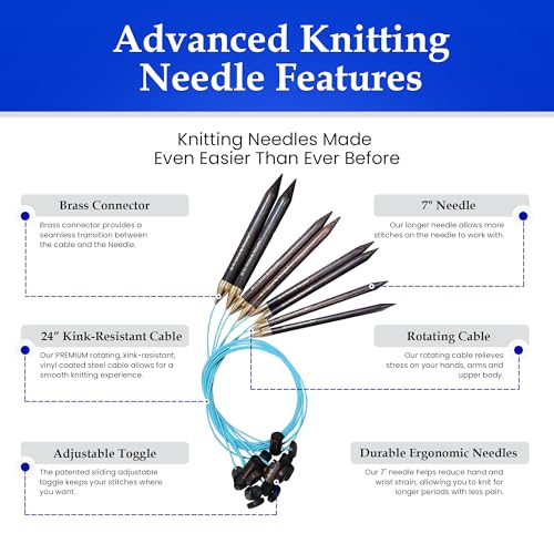 STAY-STRAIGHT KINK-RESISTANT ROTATING CABLE: Create cozy holiday gifts like Christmas sweaters or blankets effortlessly with our 24″ PREMIUM, kink-resistant, vinyl-coated steel cable. Enjoy a smooth, snag-free knitting experience with the rotating design that prevents cable twisting, ensuring consistent stitch tension for perfect holiday crafting and making your knitting projects more enjoyable.