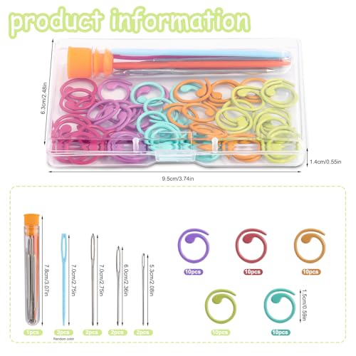 61 Pcs Sewing Accessories: Multicolor crochet locking markers 50 pcs, 5 colors, 10 pcs per color. There are also large eye plastic needles × 3, large eye blunt metal sewing needles × 6 for your sewing, plastic needle bottle × 1, transparent storage box × 1. The quantity is enough to meet your daily use and replacement needs