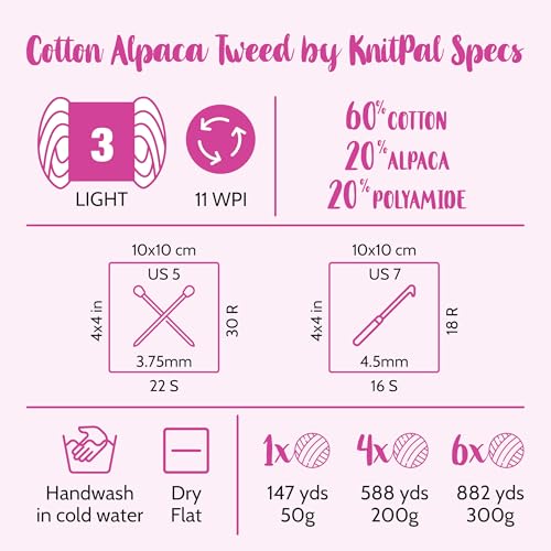 VALUE PACK: Cotton Alpaca Tweed is available in 4-ball and 6-ball bundles packs at 147 yds per 50g ball, for 588 yds/200g and 882 yds/300g respectively.