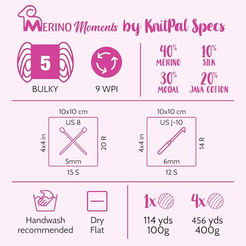 Merino Moments is a thick yarn that balances a supple feel with durable strength. Finished knits have an airy quality, soft touch, gentle drape, and sharp stitch definition. Easy on the hands, needles, and hooks, Merino Moments is an ideal fiber for bulky weight baby and adult knits.