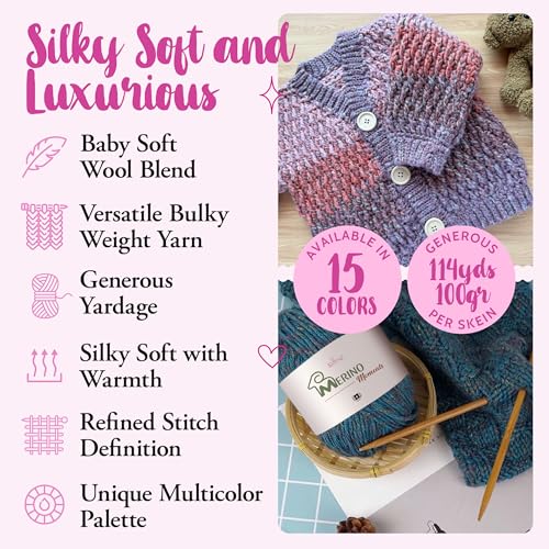 VARIEGATED MULTICOLOR YARN: Merino Moments offers a distinct palette of 15 multi colored, speckled, and heathered hues in vivid jewel tones, soft pastels, flexible neutrals perfect for both baby and adult sweaters, cardigans, hats, scarves, cowls, blankets and more.