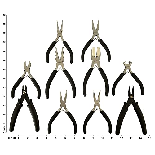 Product inclusion : 6 step bail making pliers, nylon jaw pliers, round nose pliers, bent nose pliers,flat nose pliers, side cutter pliers,chain nose pliers,crimping pliers,split ring pliers and end nippers.