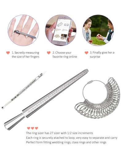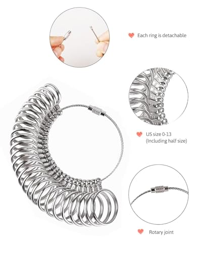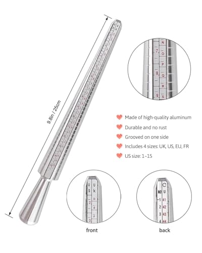 Measure Tool Size】Metal ring stick measure tool with US sizes of 2-15 and European sizes of 41-76 (come in half sizes, no quarter sizes). Ring sizer gauge: 0-13 (including half size, a total of 27 pcs rings).Plastic ring sizer belt:1-17.Package included: 1 × ring sizer gauge + 1 × ring sizer mandrel + 1 ×plastic ring sizer belt