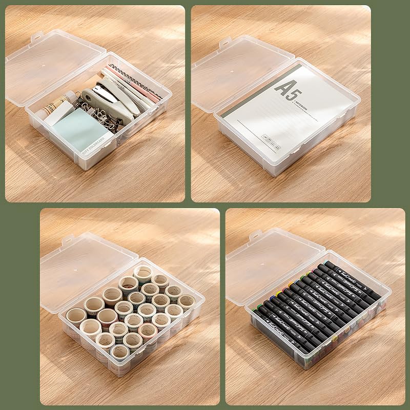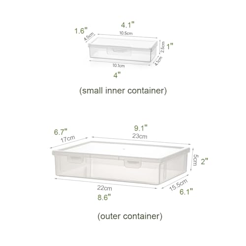 Dimensions: outer container 9.1″L x 6.7″W x 2″H; small containers 4.1″L x 1.77″W x 1″H .You can put these mini storage boxes into the big rectangle case