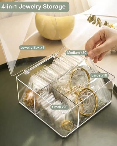 4-in-1 Acrylic Jewelry Organizers and Storage with 60 Portable Anti Tarnish Jewelry Bags, Clear Jewelry Box Travel Jewelry Case for Earrings Rings Necklaces Bracelets, Christmas Gifts for Women Girls