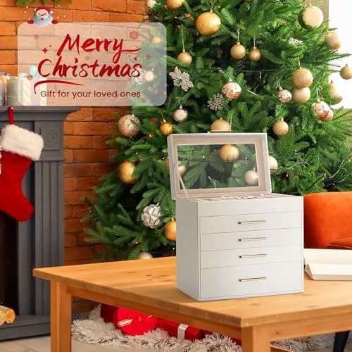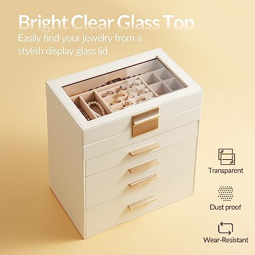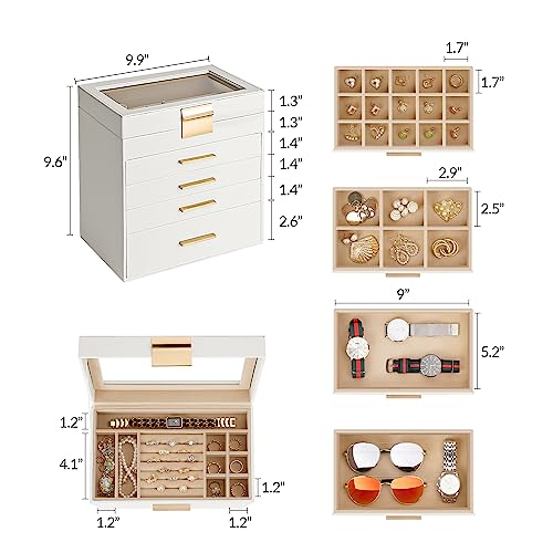 Jewelry Box, 5 Layers Jewelry Storage Display Box with Glass Lid for Women, 4 Drawers,Large Capacity for Necklace Earrings Bracelets Rings,White