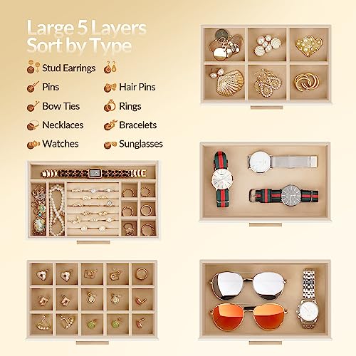 Multi-function for DIY Layer: The partition in second and third layer are removable which can meet different needs and keep all types of jewelry organized. The fourth and fifth layer provide you with enough space for placing bigger jewelry such as bracelet and sun glass