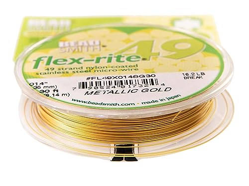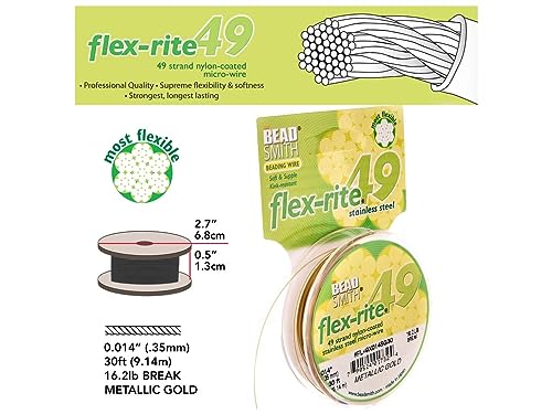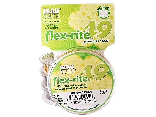 FLEX-RITE: This beading wire is made of 49 strands of stainless-steel that are then nylon coated in a metallic gold color. The wires measure .014 inches (.35mm) in diameter, on a 30-foot (9.14m) spool. This flexible wire has a 16.2lb break strength.