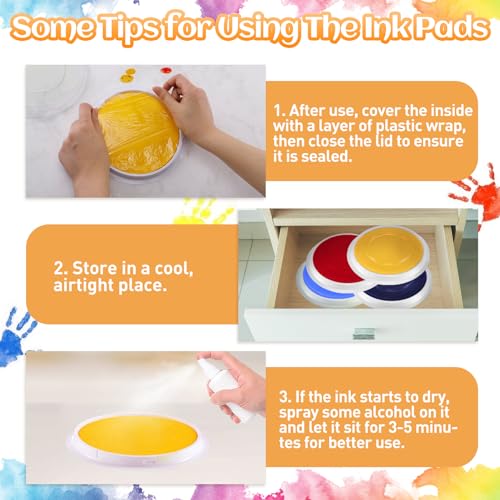 Environmental Friendly Materials: Our stamp pads adopt safe and environmental friendly pigments, which are non-toxic and harmless to children and have good colorability.【Tips: 1. After use, cover the inside with a layer of plastic wrap, then close the lid to ensure it is sealed. 2. Store in a cool, airtight place. 3. If the ink starts to dry, spray some alcohol on it and let it sit for 3-5 minutes for better use.】