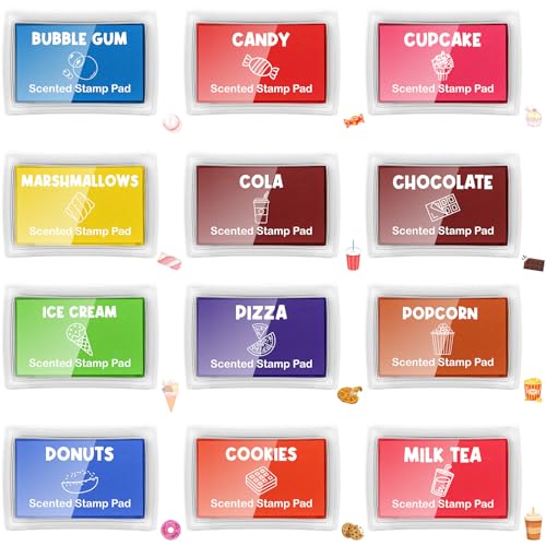 ReliThick 12 Pcs Ink Pads for Kids Scented Stamp Pad Washable Non Toxic Ink Pads Fade Resistant Craft Ink Pad with 12 Snack Stickers for Rubber Stamps Paper Wood Fabric DIY Art Supplies, 10 Colors