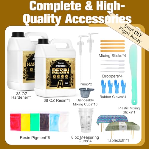 All-in-One Kit for Every Project: Includes 38oz resin, 38oz hardener, 4 gloves, 2 pumps, 4 mixing sticks, 4 droppers, 10 disposable cups, 1 plastic stick, 6 resin pigments, 4 measuring cups, and a tablecloth. Everything you need for a clean, hassle-free crafting experience!