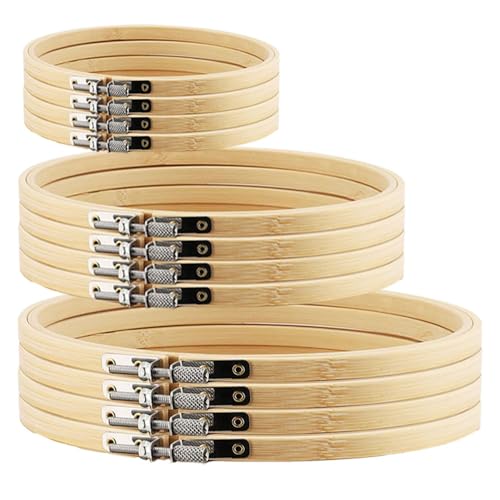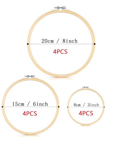 12 Pieces Embroidery Hoops, Bamboo Frame Circle Cross Stitch Hoop Ring Embroidery Hoops Set for Embroidery and Cross Stitch (Bamboo, 3IN *4 + 6IN *4 + 8IN *4)
