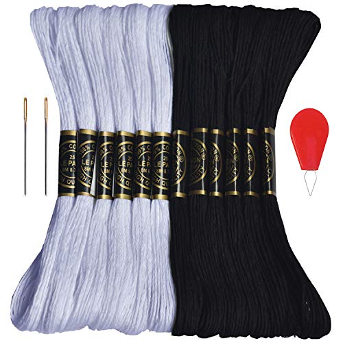 Premium Embroidery Floss-Cross Stitch Threads-Friendship Bracelets Floss-Crafts Floss-Black,White-Hand Embroidery Thread 12 Skeins Per Pack and Free Set of 2 Embroidery Needles and 1 Needle Threader
