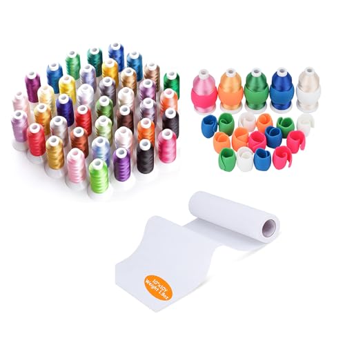 Perfect Combination:550 Yards each spool individually wrapped, 40 WT standard of Polyester Embroidery Machine Thread. Perfect for all your embroidery sewing projects.Cut the tear away embroidery stabilizer into a size as you want, hoop it together with the fabric, then stitch; tear away and clean the stabilizer around the stitches after finishing your project.Spool huggers are designed to be thin enough to not create space issues when stored in a spool or spool box.