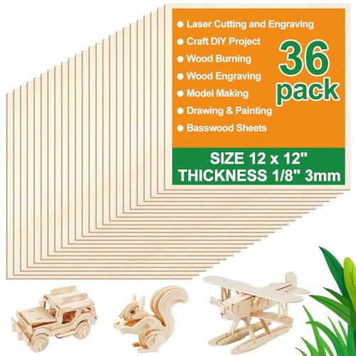 36 Pack Basswood Sheets 12 X 12 X 1/8 Inch Wood for Crafts, Basswood Plywood, Unfinished Wood, Balsa Wood Sheet for Laser Cutting and Engraving, DIY Crafts, Wood Burning, Model Making