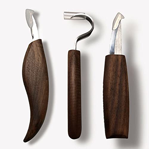 【Hook Knife】: This kind of knife is great tool for a “beginner”, which is solidly built, and the oak handle is very comfortable, with flats on the side of the handle will give you good tactile feedback. Most important, the blade is sharp enough for hollowing out cup, spoons or bowls without too much strengh. Perfect for carveing concave shapes and rounded edges for any wood carving project