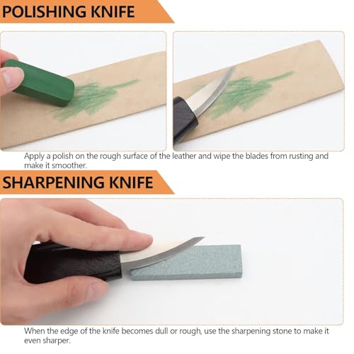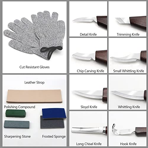 15PCS DELUXE CARVING TOOLS SET:Include 8 knives of different shapes, 1 leather strop, 1 sharpening stone, 2 frosted sponge, a pair of cut resistant gloves, 1 polishing compound and a long leather pouch.