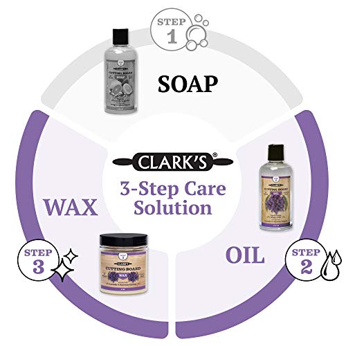 INCLUDES: CLARK’S Cutting Board food grade mineral oil (12oz), Cutting Board wood wax (6oz) & CLARK’S Custom Applicator and Buffing Pad.