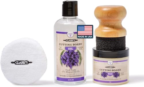 CLARK’S Cutting Board Oil and Wax Kit – Set includes Food Grade Mineral Oil (12oz), Finishing Wood Wax (6oz), Applicator Sponge & Buffing Pad, Enriched with Food Safe Lavender and Rosemary Extract