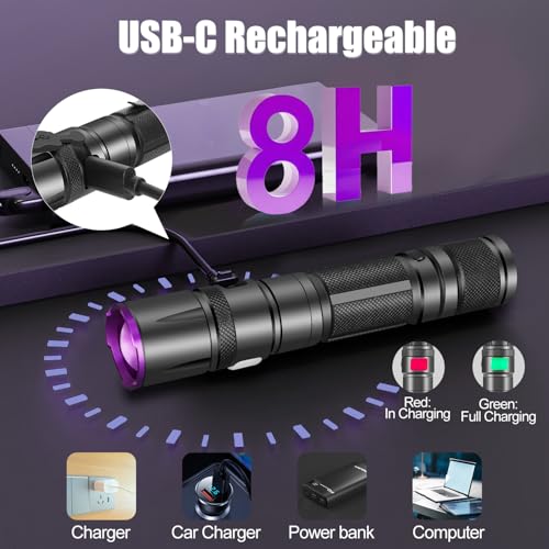 LONG-LASTING USB-C RECHARGEABLE UV LIGHT: The uv flashlights can work for 5-10 hours with large rechargeable battery. Power indicator will turn RED to remind you to charge. Use the included type-c charging cable contect the uv light to any usb power source(laptop, power bank, adapter) could recharge it. The rechargeable uv flashlight don’t have to buy and replace dry batteries frequnently then traditional uv light to SAVE MONEY & IMPROVE ENVIRONMENTAL FRIENDLINESS
