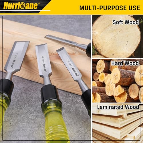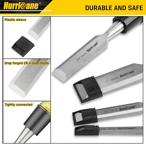 HURRICANE 4 Piece Wood Chisel Set for Woodworking, CR-V Steel Beveled Edge Blade, Durable PVC High Impact Handle Wood Chisel