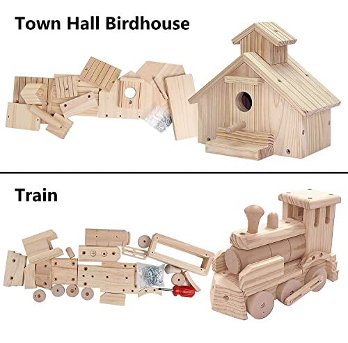 Kraftic Woodworking Building Kit for Kids and Adults, 2 Educational DIY Carpentry Construction Wood Model Kit Toy Projects for Boys and Girls – Build a Wooden Town Hall Birdhouse and Train